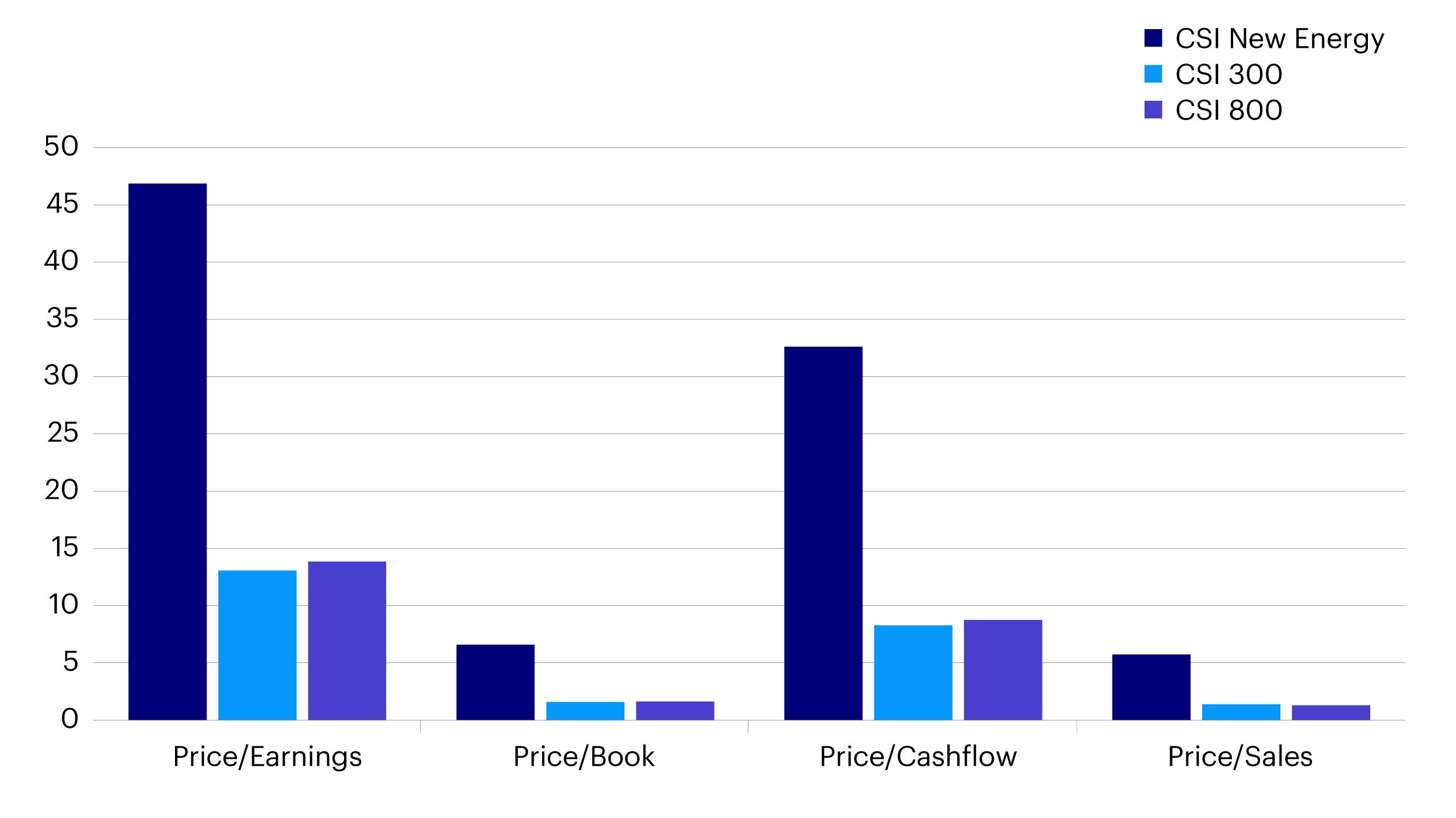 Source: IGW, data as of July 31st, 2021. Cross sectional correlation between ESG and major risk factors of 512 China A-shares companies. ESG factors based on MSCI ESG Ratings and risk factors based on Barra China Equity Model (CNE5).Although ESG data in China is relatively young, we believe there is scope for constructing ESG factors by identifying material issues relevant to the China equity market.Our research has shown that a company’s overall sustainability profile, as measured by a diverse set of criteria ranging from its environmental pollution management and workplace safety to board professionalism, may have a positive linkage with stock return. The implication is that ESG factors not only provide downside risk protection but also present a possible source of alpha.This is supported by research from the United Nations Principles for Responsible Investment (PRI) which found that portfolios that systematically select stocks with superior ESG characteristics (best-in-class) or incorporate ESG profiles into weightings (tilting strategy) show an increase in alpha delivered over a six-year period.1Apart from analyzing structured ESG data obtained from third-party sources, artificial intelligence (AI) and machine learning techniques can also be used to extract subtle ESG insights directly from firms’ written reports. To that end, we have recently partnered with Tsinghua University to study the transformation of carbon-intensive sectors and its impact on ESG investing in China.Low carbon risk premiumWe believe that the low carbon transition in China may be developing into a major source of risk premia. To meet the dual goals of reaching peak carbon emissions before 2030 and achieving carbon neutrality by 20602, China’s non-fossil fuel consumption is expected to account for a quarter of its total energy consumption by 2025 before growing to 80% by 2060 according to the State Council’s target. This has already led to a rise in the valuation premium of new energy related industries ranging from electric vehicles to wind- and solar- power supply chains (Figure 2).Figure 2: Valuation ratios of China’s renewable energy companies relative to index