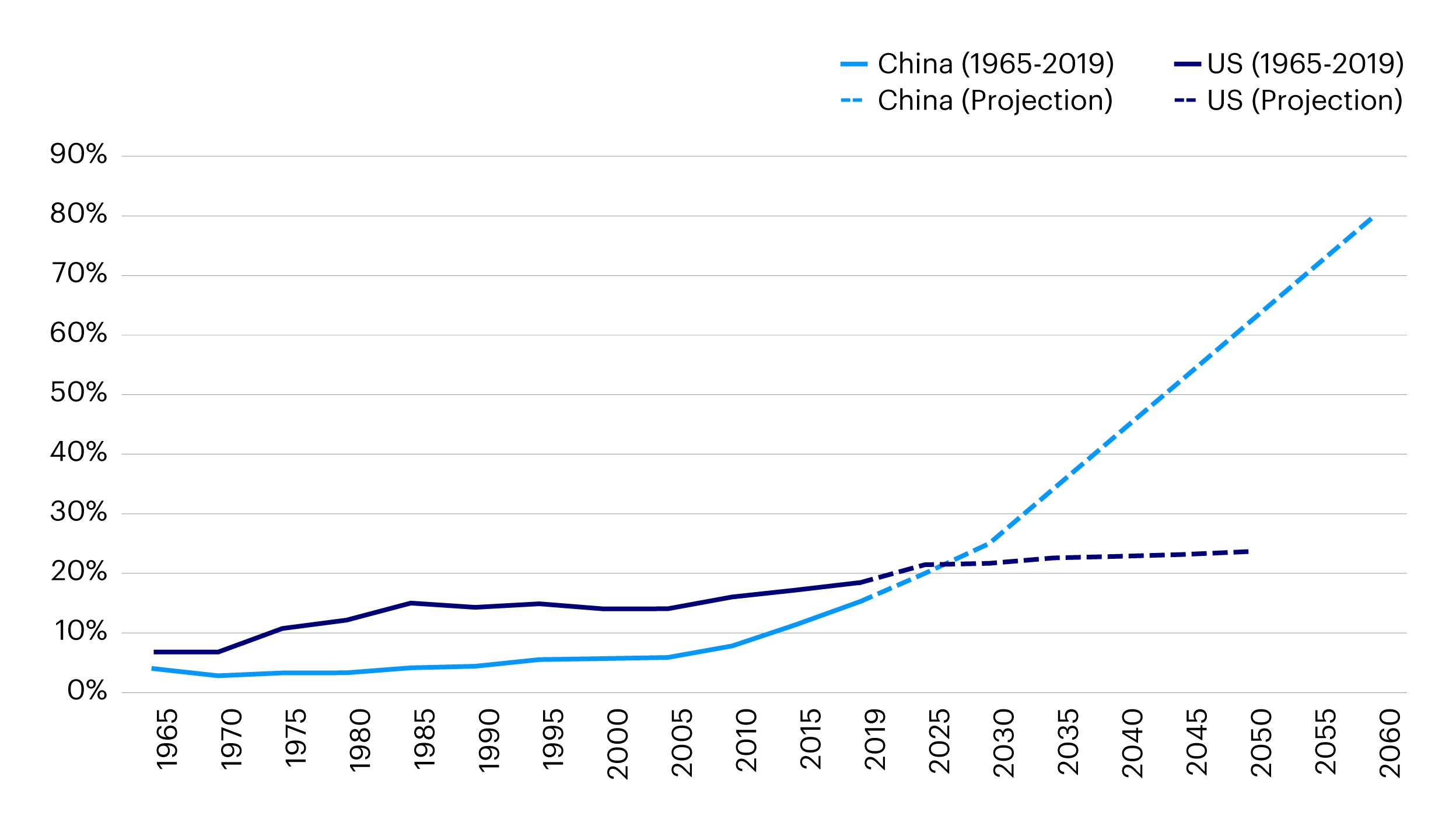 Source: Wind, data as of January 28, 2022.China’s transition to a low carbon economy is often headlined by the projected growth of its non-fossil fuel as a proportion of total energy consumption (Figure 3). However, it is more likely to entail a much more pervasive change for all types of companies. To achieve carbon neutrality while remaining a major industrial powerhouse, we expect that Chinese companies in the energy intensive sectors such as mining and heavy industries will eventually need to adopt a carbon reduction mandate in their operations with the help of technological innovation and business transformation. On the other hand, consumer companies will also need to cater to a growing middle class whose preferences are gravitating towards greener choices. The competing demands of economic growth and decarbonization could mean that a sweeping transformation will eventually touch every industry in China in the coming decades, albeit at a difference pace.Figure 3: Non-fossil fuel consumption as a proportion of total energy consumption
