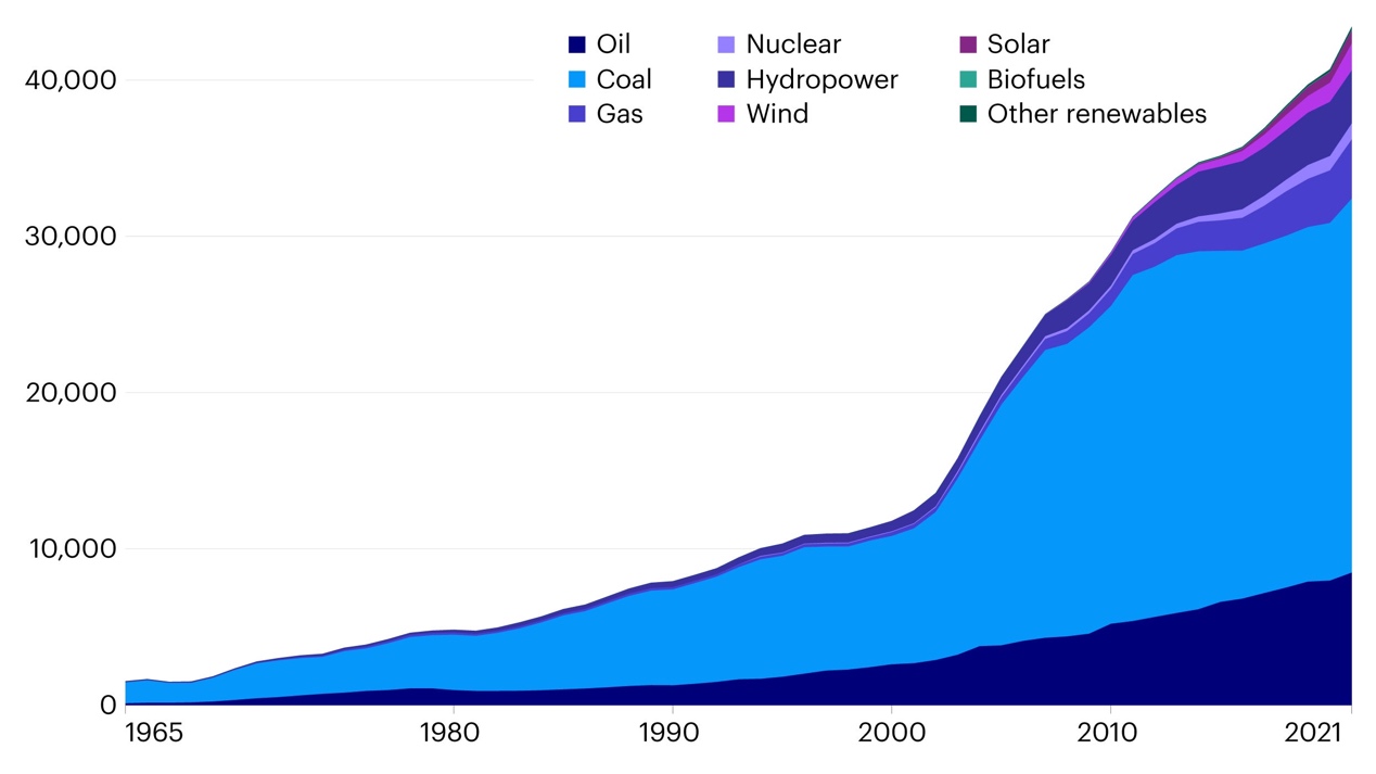 Between 2012 and 2021, the total share of solar and wind energy in China’s power generation increased four-fold from 2.6% to 11.8%.1 Policy drivers There are three major policy drivers supporting the growth of solar and wind industries: The government’s aim to achieve peak carbon emissions by 2030 and carbon neutrality by 2060 has provided a supportive environment for companies in the solar and wind sectors.2 Despite the rapid development of China’s renewable power generation capacity over the last decade, the country’s installed power capacity is still dominated by coal and oil. In 2021, solar and wind power reached 27% of China’s installed capacity and only 12% of the country’s power generation. The potential for growth is huge and given the plans for wind and solar project installations in the next few years, these sectors expected to account for 45% of total installed capacity and close to 20% of power generation in China by 2025.4 Figure 1 - China’s primary energy consumption by source