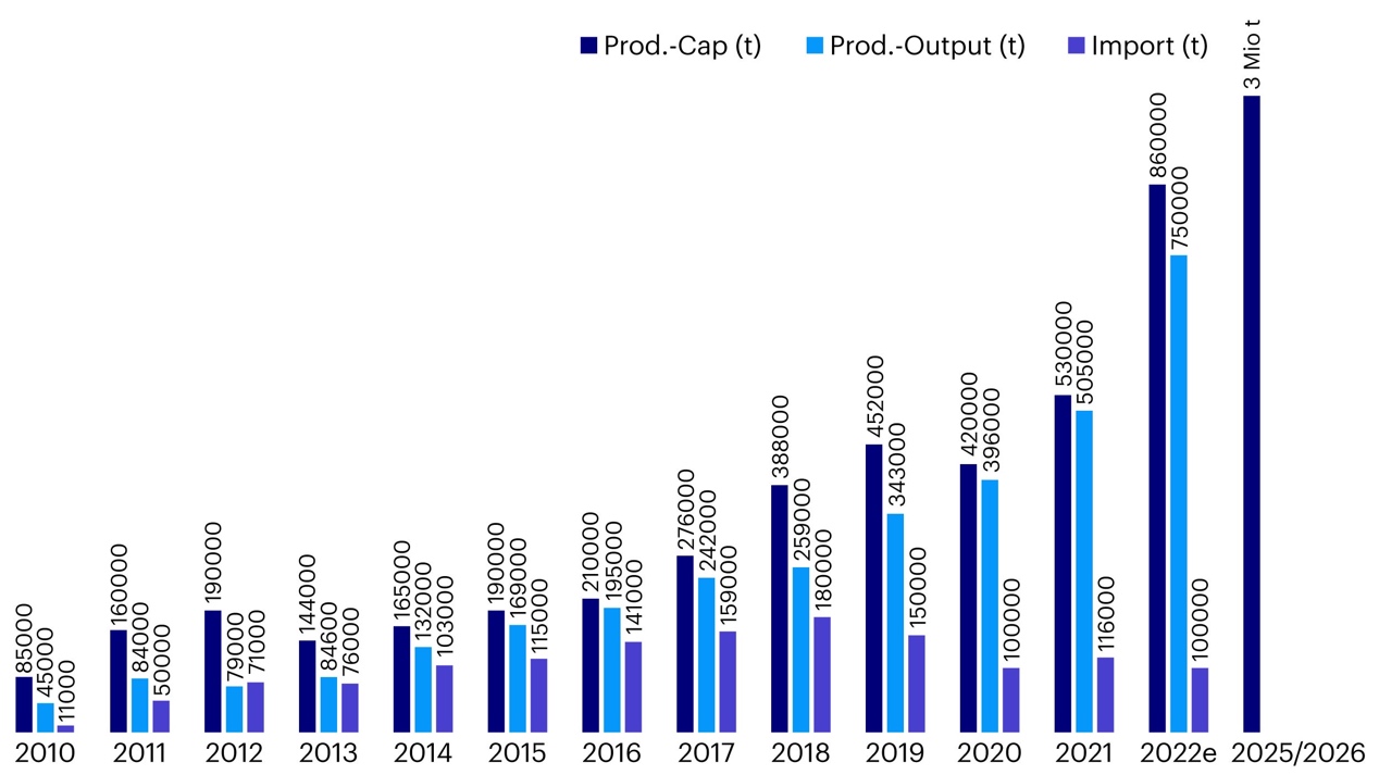 Source: BP Statistical Review of World Energy 2022, data as of 2021. Note: ‘Other renewables’ includes geothermal, biomass and waste energy. 3. In the long run, China’s policymakers are looking to boost their domestic renewable energy capacity to avoid having to rely on foreign sources. Recent geopolitical concerns stemming from Russia’s invasion of Ukraine has made this mandate more critical. The war has catalyzed the government’s push to reduce foreign dependence on oil, as countries across the globe battle escalating energy costs. Competitive advantages Solar power: Figure 2 – China’s Silicon Production Capacity Developments - 2010 - 2025/6e