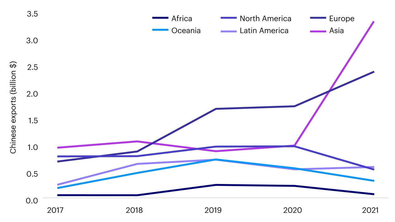 Source: AECEA, data as of February 2022. Wind power: Figure 3 - Chinese wind turbine exports by region